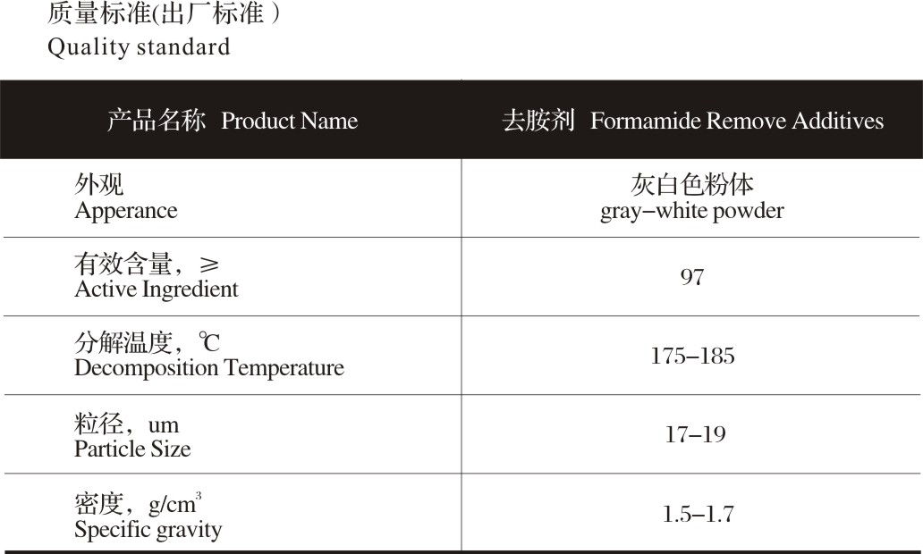去胺剂用于AC发泡剂生产的NBR、EVA、PE、PVC等多种塑料和橡胶制品。